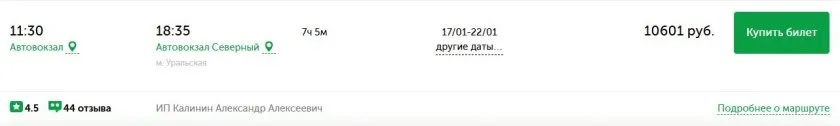 Многих жителей Кургана шокировал обновлённый ценник, но это сбой в системе и не ошибка в стоимости билета. Такие цены указаны сразу на нескольких сайтах по продаже билетов. Напомним, что цены на билеты устанавливает перевозчик. Александр Калинин же выполняет рейсы из Кургана до Южного и Северного вокзалов Екатеринбурга.