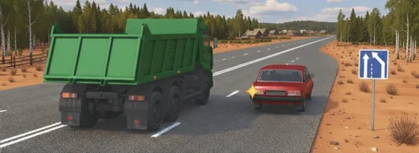 На картинке типичная ситуация: дополнительная полоса заканчивается, о чём предупреждает знак 5.15.5 «Конец полосы». Легковая машина вынуждена смещаться вправо, где уже едет грузовик.