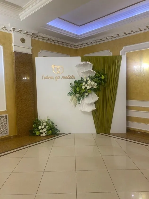 Зона оформлена в нежной цветовой гамме: белый фон с золотыми кольцами и традиционной надписью «Совет да любовь», а также декоративные белые цветы и зелень. Дизайн гармонично сочетается с внутренней отделкой зала. По замыслу организаторов, стильные детали и специальное освещение помогут создать идеальные свадебные кадры.
