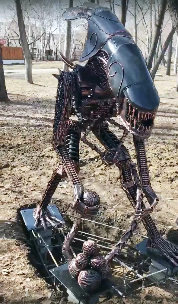 Сложно вообще себе представить подобное, но в апреле 2021 года установка этой жанровой скульптуры вызвала бум в социальных сетях. Курганцы по достоинству оценили "детище" Ридли Скотта, обосновавшееся в центральном парке города. Как сообщали в то время в группе ВК "Доброе утро, Курган!", фигуру изготовили в мастерской «Ковка-Дизайн». В момент своего появления "Чужой" вызвал больше положительных эмоций, чем негатива. Многие горожане с интересом рассматривали персонажа знаменитых триллеров и делали с ним селфи. Крупные федеральные СМИ также не обошли гостя из Космоса стороной.