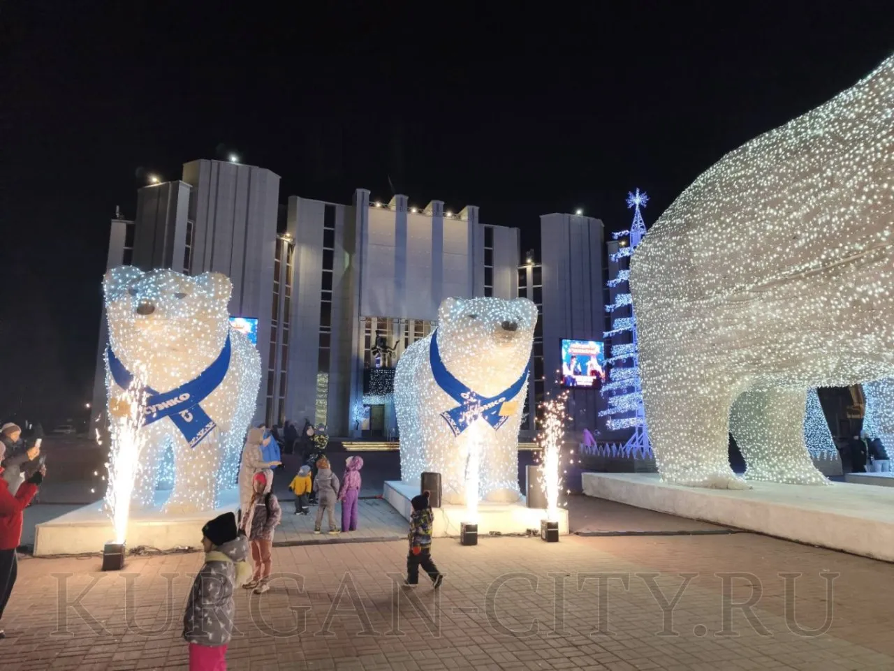 На Троицкой площади Кургана зажглась новогодняя инсталляция «Белые мишки СУЭНКО». Фигуры медвежьей семьи, вернувшиеся на своё традиционное место у областной филармонии, были торжественно включены под аплодисменты горожан.